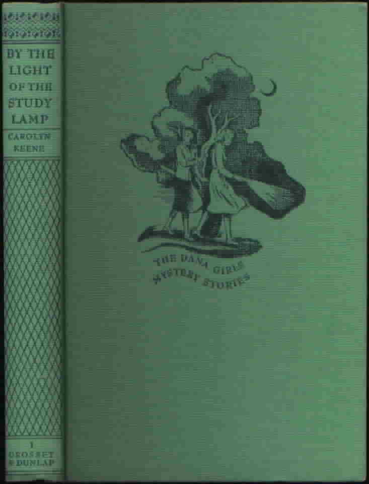 Dana Girls #1-13 printed from 1950 to 1951 have the wraparound dust jacket with the spine symbol and number present on the spine. The books are solid green with green and white endpapers. Each book has a plain paper frontispiece illustration.